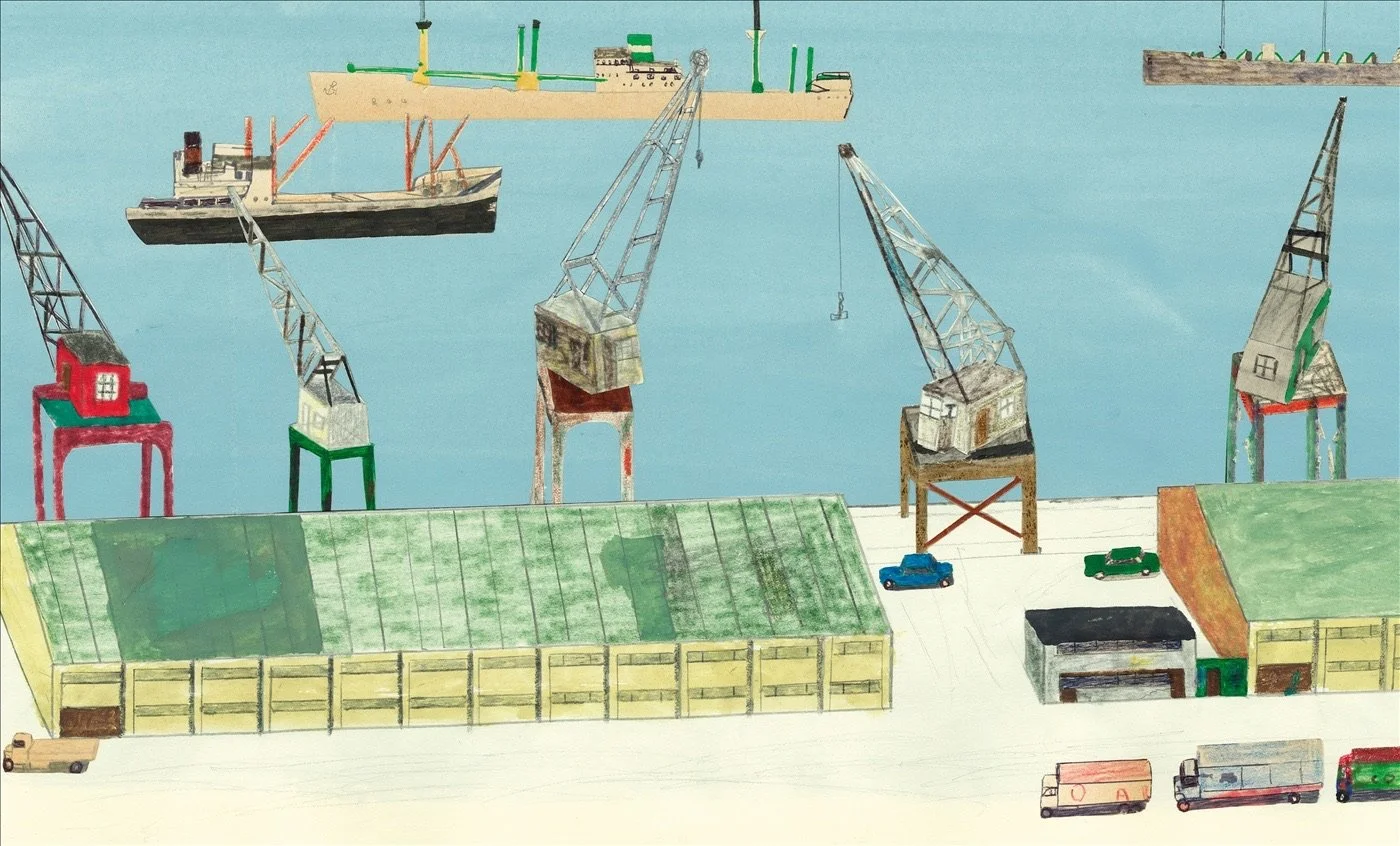 Tillsammans tittar vi på bilderna i Sailor och Pekka och pengarna. Han visar mig detaljer som jag hade missat, figurer från tidigare böcker som gör cameos och hur han arbetar med perspektiv. Vi är alltid på marken och ser upp mot husfasader och himlen, han pekar på bilderna.