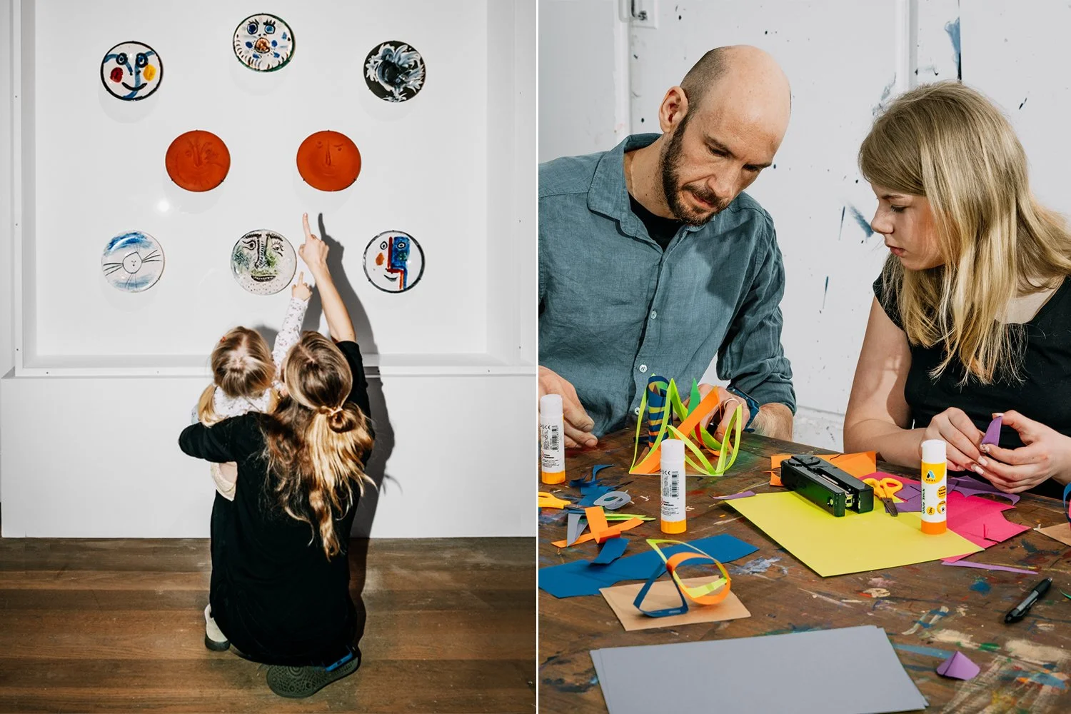Från vänster till höger: Pablo Picasso, Utställningsvy, Sena Picasso. © Succession Picasso/Bildupphovsrätt 2025. Skapande i Verkstan på Moderna Museet. Foto: My Matson/Moderna Museet.
